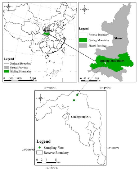 The study site is located in the Changqing National Nature Reserve, south slope of the Qinling Mountains, China (Figure 1). The reserve has an area of 29,906 ha approximately, with elevational range between 800 and 3071 m asl, and its forest coverage is greater than 90%. It is a transitional climate region between the north subtropics and the warm temperate zone, types of forest vary from sub-tropical to cold temperate.