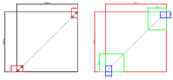 Field sampling design, whereas 100 m × 100 m quadrat in black line was the permanent sample plot, 10 m × 10 m. Quadrats in red line were tree layer investigation plot, 3 m × 3 m quadrats in green line were shrub layer investigation plot, and 1 m × 1 m quadrats in blue line were herb layer investigation plot.
