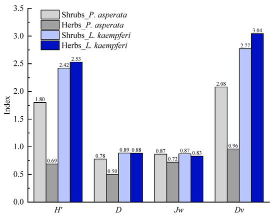 Compared to P. asperata forest, 39 species were observed, and 2 were trees, 16 were shrubs, and 21 were herbs, which were much higher than P. asperata forest. Among the tree species, L. kaempferi was dominant with the occurrence frequency of 97.78% in the sample area. The density of L. kaempferi was 2200 trees·ha−1, with the average DBH and average tree height of 15.37 ± 3.56 cm and 11.06 ± 1.08 m, respectively (Table 2). Diversities (H′, D, Jw, and Dv) of the shrubs and herbs layers were also higher than those of P. asperata forest, which were 2.42, 0.89, 0.87, and 2.77 for the shrubs layer, 2.53, 0.88, 0.83, and 3.04 for the herbs layer, respectively. Biodiversity was much better than that of P. asperata forest (Figure 3).