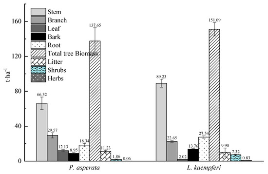 The total biomass (including litter biomass) of vegetation in L. kaempferi (169.15 ± 13.44 t·ha−1) was greater than that of P. asperata (150.80 ± 16.75 t·ha−1). In part, biomass of trees, shrubs, herbs, and litter in L. kaempferi were all greater than those in P. asperata. In terms of different components of trees, biomass of leaf and root in P. asperata were higher than those in L. kaempferi, though the biomass of trees in L. kaempferi (151.09 ± 7.68 t·ha−1) was much higher than that in P. asperata (137.65 ± 15.12 t·ha−1) (Figure 4).