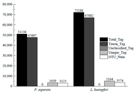 A total of 123,322 tags and 6,697 OTUs (at 97% similarity threshold) were identified in the present study (Figure 5). For P. asperata forest, 3123 OTUs were obtained and identified as 36 phyla, 310 genera, which were less than those of soils in L. kaempferi forest with 41 phyla and 368 genera identified (Table S2).