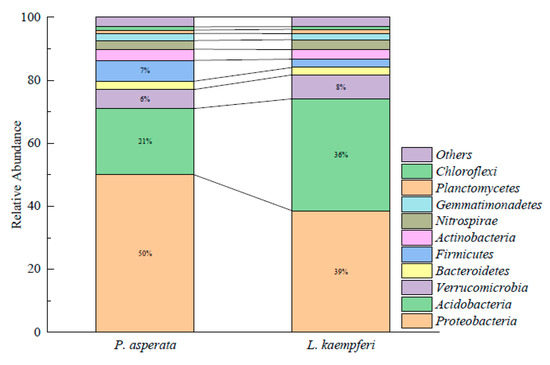 Top ten bacterial phylum of the two soil groups from P. asperata and L. kaempferi forest.