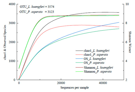 Alpha diversity measured by the Shannon (H′) index, chao1 and observed species, showed significant differences between two different forest types. Lower values were observed in the P. asperata forest, with values of 8.80, 2799.40, and 2706, respectively, while those in the L. kaempferi forest were 8.86, 3565.47, and 3040, respectively (Figure 7). This pattern was similarly to the plant alpha diversity.