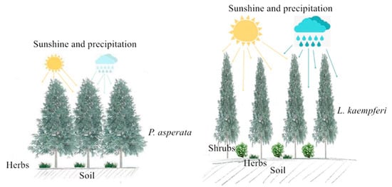 Conceptual figure of P. asperata and L. kaempferi forest, where less sunshine and precipitation can reach to ground in P. asperata forest than in L. kaempferi forest.