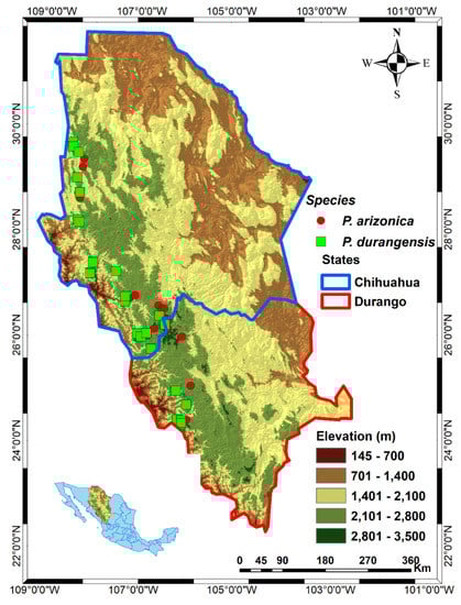 Location of the studied populations of Pinus arizonica and P. durangensis in the states of Chihuahua and Durango, northwestern México.