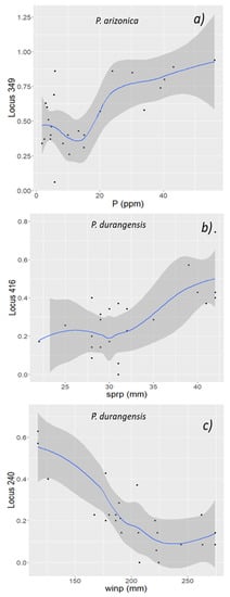 Using individual outlier loci, we observed four moderate but significant (p < 0.001) positive covariations between the relative frequency of some outliers (209, 314, 349 and 351) in P. arizonica and soil phosphorus concentration (P) and spring precipitation (SPRP; Table 1). For P. durangensis, two significantly negative and moderate covariations were detected (C = −0.91 and −0.81; p < 0.001) for the relative frequency of two outliers (240 and 416 frAFLP) with WINP and LAT, and positive covariations were observed for four other markers (236, 406, 416 and 342) and SPRP, MTWM, latitude and aridity index (AAI; Table 1).