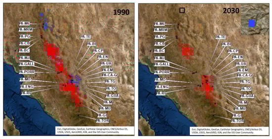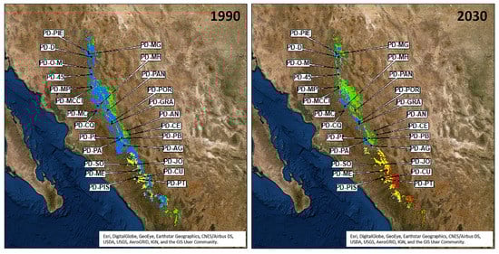 Finally, SDMs built for 1990 and 2030 were compared with current data (2017–2019), available from forest resources management programs for four regions (UMAFORES 0802, 1001, 1005 and 1010) ([81,82,83], Unión de Permisionarios de la Unidad de Administración Forestal La Flor Durango A.C. 2019 and Unidad de Administración Forestal Santiago Papasquiaro A.C. 2019). These programs are based on forest inventories conducted in northern, central and southern locations of the geographical distribution of both species.