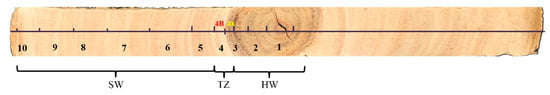 transition zone (TZ; 4X, 4B), and sapwood (SW; 5, 6, 7, 8, 9, 10).