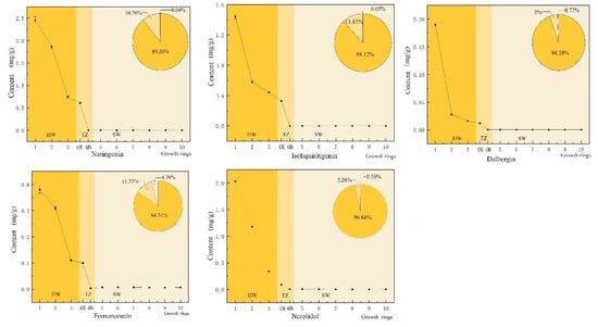 Flavonoids and terpenoids are the main secondary metabolites in the heartwood of D. odorifera []. Flavonoids are generally considered the as main source of color in mahogany heartwood []. In D. odorifera, the percentage composition of the four characteristic flavonoid compounds exhibited an overall increasing trend from sapwood (the 6–10th growth ring) to heartwood (the 1st–3rd growth ring), and abrupt changes occurred in the transition zone (the 4th growth ring, Figure 2). The amount of these flavonoids in the heartwood accounted for 84.3–94.3% of the total content in the xylem, while that in the transition zone accounted for 5.0–11.8% and that in the sapwood accounted for 0.03–4.4%. Terpenoids are mainly responsible for the aroma of mahogany, and one of the characteristic volatile components of D. odorifera is trans-nerolidol. The distribution pattern of trans-nerolidol in the xylem was the same as that of flavonoids. The heartwood had the highest content of trans-nerolidol, accounting for approximately 96.8% of the total, while the transition zone and sapwood accounted for approximately 2.6% and 0.5%, respectively.