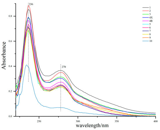 The UV–Vis spectra of lignin from different growth rings are shown in Figure 3. The maximum absorption peak of all lignin appeared around 236 nm, which was the characteristic absorption of lignin benzene ring []. There was a medium intensity absorption band at 274–280 nm, which is the absorption peak of lignin syringyl group [], indicating that D. odorifera lignin is mainly syringyl group, which is consistent with the conclusion of the infrared spectrum (Figure 4). The characteristic absorption of syringae increased gradually from the outer layer of sapwood (the 9th growth ring) to the inner layer of heartwood, which was supposed to be the result of the continuous lignification process of xylem parenchyma cells. In addition, the UV–Vis spectrum of lignin in the outermost layer (tenth growth ring) of the sapwood was significantly lower than that of other growth rings, which may be because the wood was too young and in the initial stage of lignin deposition. The change in the absorption maxima in the UV–Vis spectrum of lignin is consistent with the changes in lignin color, which is due to the unsaturated structure of the benzene ring. Benzene easily forms a conjugated system responsible for the color of wood and can also be connected with an auxiliary color group to further deepen the wood color [].
