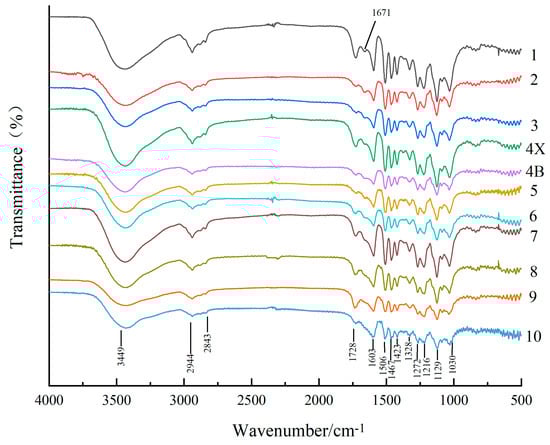 Infrared spectrum (Thermo Fisher Scientific, Waltham, MA, USA) analysis: The lignin sample was carefully ground, 1–2 mg of the sample was ground with 0.1 g potassium bromide, and the mixture was pressed into a tablet. The analysis was performed in the measurement range of 500–4000 cm•1 with 32 cumulative scans; the OPD speed was 0.2 cm/s, the resolution was 4 cm−1, and the KBr interference was deducted in real time. The experiment was repeated three times.