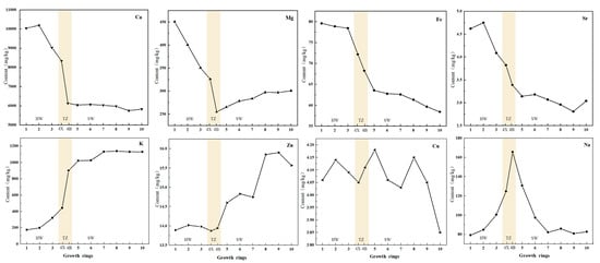 Radial variation of mineral elements (Ca, Mg, Fe, Sr, K, Zn, Cu, Na) along the growth ring. Mineral elements are marked in the upper right corner. The horizontal axis shows the change of the growth ring from the pith (the first growth ring) to the outermost sapwood (the tenth growth ring). heartwood (HW; 1, 2, 3),