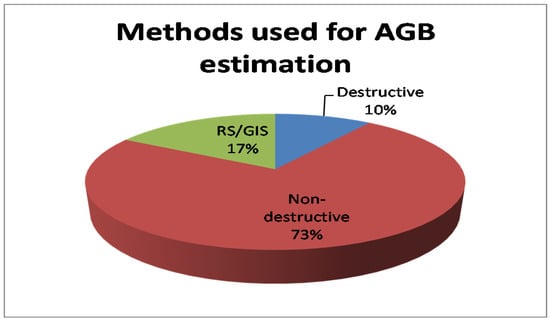 Remote sensing and Geographic Information System (GIS) is a new method for forest biomass estimation. Various studies have been carried out for calculating forest biomass with the help of remote sensing [33,34,42]. Nonetheless, biomass calculation through field data is crucial for the calibration of remote sensing models and verifying results for remote sensing methodologies. Tree allometric equations of the same species and the same ecological conditions are more reliable and precise for forest biomass and carbon stock estimation [2]. Methods used for above-ground biomass estimation in Pakistan are given in Figure 3.