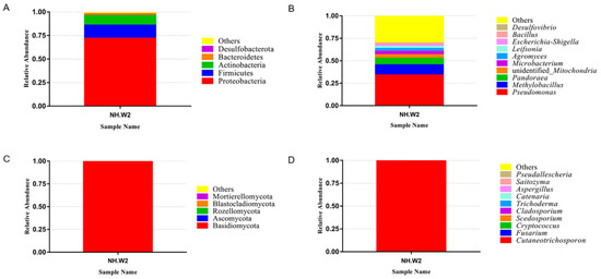The relative abundance of microbial communities in monitoring tank 8 (NH. W2). The relative abundance is shown as a percentage. Phylum and genera are colored according to the legend on the right. (A) Relative abundance of bacteria at phylum level. (B) Relative abundance of bacteria at genera level. (C) Relative abundance of fungi at phylum level. (D) Relative abundance of fungi at genera level.
