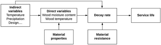 The principle behind modelling the risk and influence of fungal decay is to incorporate aspects of the life-cycle and environmental requirements. For the growth and development of fungi, certain conditions regarding moisture and other physicochemical parameters like pH, oxygen, temperature and nutrients are required [21,22]. Due to the ecological scale of these organisms, environmental conditions also need to be scaled accordingly. For instance, the environmental conditions in and directly around a timber component present a habitat to the colonising fungi. As such, the conditions of the macroenvironment do not directly influence the fungi, but can indirectly influence the climate inside the woody material. In practice, direct variables, like material temperature and moisture content (MC), have proven to be useful in assessing decay development [23]; however, these variables are not frequently captured and are practically challenging to derive, as they depend on both the external environmental conditions and the properties of the wood. Therefore, some models recommend the use of indirect variables, which, in contrast to direct variables, are independent of the material at hand. Indirect variables utilise the indirect causality between macroclimate, local climate, design and decay rate. Figure 1 is a concept introduced in [24] that was later implemented by [9]. The concept illustrates how direct or indirect variables can be used to estimate SL ultimately. Additionally, Figure 1 acts as a framework that depicts the content that will be discussed further.