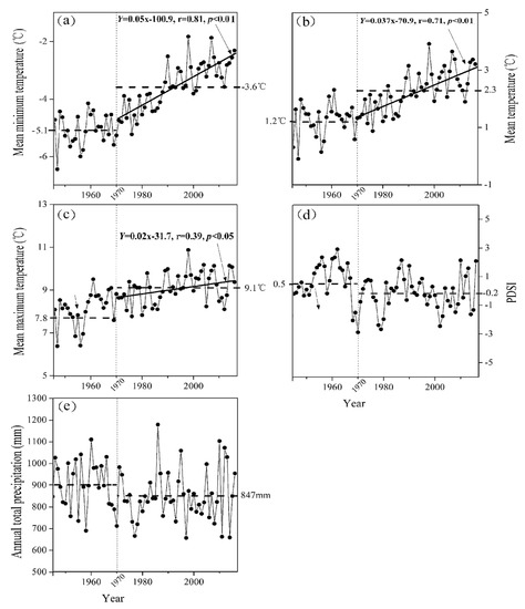 - Wang, Y.P.; Wang, H.; Zhang, W. Variation and tendency of surface aridity index from 1960 to 2005 in three provinces of northeast China. Adv. Earth Sci. 2008, 23, 619–662. (In Chinese) [Google Scholar]