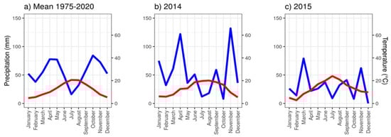 Bagnouls-Gaussen ombrotermic diagram of mean climatic temperature (in red) and precipitation (in blue) by month in the study site. (a) Mean monthly data from 1975 to 2020. (b) Mean monthly data for 2014. (c) Mean monthly data for 2015.