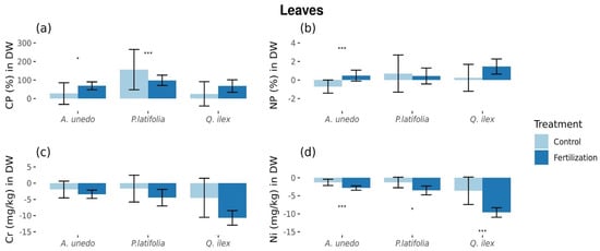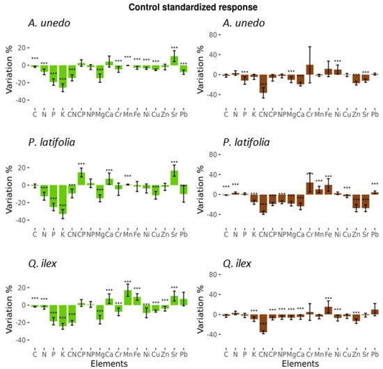 Among the micro-elements, there were differences in leaf concentrations of chromium (Cr) in Q. ilex, where there were decreases of 1.68 ± 1.83% and 3.56 ± 0.68% in the untreated and treated plots, respectively (difference between treatments: p < 0.05; ±standard error (SE) showed; Figure 1c), while leaf concentration of nickel (Ni) in A. unedo decreased by 0.76 ± 0.41% and 1.49 ± 0.28%, respectively (difference between treatments: p < 0.05; ±standard error (SE) showed), and decreased in Q. ilex by 1.86 ± 1.79% and 4.67 ± 0.62% (difference between treatments: p < 0.05; ±standard error (SE) showed; Figure 2d) (Table S1). There were no treatment differences in leaf concentrations of Ca, Mn, Fe, Cu, Zn, Sr, or Pb in the three species.