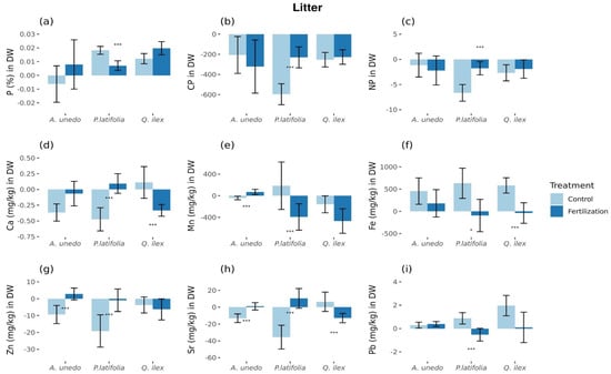 There were differences in litter concentration of micro-elements among the species (Figure 3d–i, Table S2). A. unedo leaf litter of Mn, Zn, and Sr increased from −1.29 ± 0.82%, −12.25 ± 3.57%, and −9.44 ± 2.7% in the untreated plots to 1.44 ± 1.22%, −4.16 ± 2.33%, and −1.86 ± 2.33%, respectively, in the N fertilized plots (difference between treatments: p < 0.05; ±standard error (SE) showed), while P. latifolia leaf litter concentration of Ca, Zn, and Sr increased from −19.88 ± 5.35%, −18.73 ± 6.35%, and −21.44 ± 7.58% in untreated plots to −3.39 ± 4.53%, −6.64 ± 4.44%, and 3.19 ± 6.27%, respectively, in N fertilized plots and concentration of Mn and Pb decreased from 4.33 ± 10.88% and 4.04 ± 2.52% to −10.01 ± 6.04% and −3.24 ± 2.83%, in the untreated and treated plots, respectively (differences between treatments: p < 0.05; ±standard error (SE) showed). Q. ilex leaf litter concentration of Ca, Fe, and Sr decreased from −2.89 ± 7.32%, 16.58 ± 5.21%, and 1.02 ± 6.15% in control plots, respectively, to −15.77 ± 2.70%, −2.17 ± 6.95%, and −9.32 ± 2.91% in N fertilized plots, respectively (differences between treatments: p < 0.05; ±standard error (SE) showed).