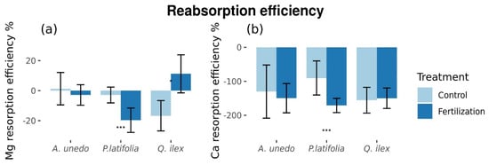 There were no effects of treatment on resorption of N, P, or K. While there were no differences in micro-element resorption in A. unedo, resorption of Mg and Ca in P. latifolia decreased from −2.91 ± 5.28%, and −90.2 ± 50.17% in untreated plots, respectively, to −19.71 ± 8.12% and −171.1 ± 20.99%, respectively, in fertilized plots (differences between treatments: p < 0.05; ±standard error (SE) showed; Figure 4, Table S3).