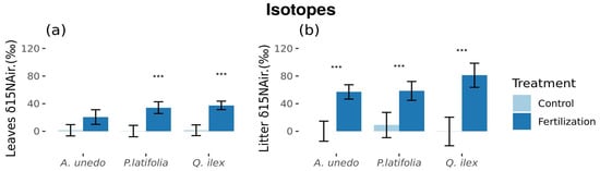 Isotopes statistically different between control and fertilized plots. (a) Foliar tissue (b) Foliar-litter tissue. *** = Significant differences (p < 0.05). Figures with standard error. A. unedo and Q. ilex foliar δ15N are significantly different from litter δ15N.