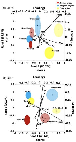 The GDA driven by variation in δ13C, δ15N, K, Ca, Mn, Fe, Cu, and Zn concentrations (Table 1a) clearly separated the foliar elemental concentrations by species within and between treatments (Table 1b, Figure 6a). Similarly, there was clear separation of species in foliar litter within and between treatments (Table 2b, Figure 6b), driven by variation in δ13C, δ15N, N, P, K, Ca, Mn, and Fe concentrations (Table 2a). The variable loading most strongly in fertilized plots, separating them from control plots in leaves, is clearly δ15N and with lower intensity δ13C, while Cu, Mg, and Ca load to control plots. In litter, δ15N is the strongest variable loading in fertilized plots with N in lower intensity. Contrarily, Fe and Mn load to control plots.