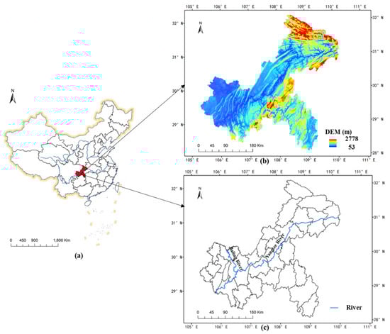Chongqing is located between 105°17′–110°11′ E and 28°10′–32°13′ N (Figure 1). It covers an area of approximately 82,400 km2. The elevation ranges from 53 to 2778 m, with high topographic relief. This region exhibits diversified geomorphic types, which include mountainous areas (75.9%), hilly areas (18.2%), and flat areas (only 5.8%). The climate is a typical subtropical monsoon climate with an annual average temperature of 17 °C. The annual average precipitation is 1200 mm, with the rainy season lasting from April to September. Chongqing is the newest of the four municipalities under the direct leadership of the central government and the largest economic center in the upper reaches of the Yangtze River. The Yangtze River runs southwest to northwest through Chongqing. As a tributary, the Jialing River joins it at the center.