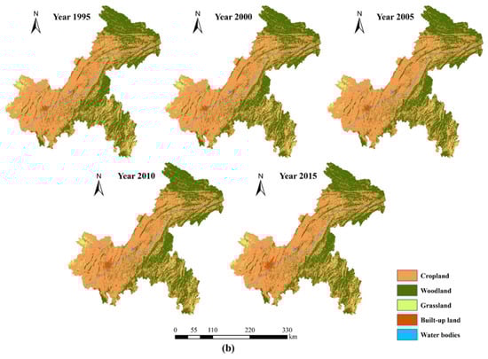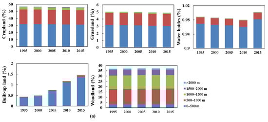 Cropland and woodland were the two largest land use types in the mountain region, whereas built-up land and water bodies accounted for the smallest proportions (Figure 2). The cropland was concentrated in low altitudes (Figure 2a). It decreased slightly from 1995 to 2015, and the decrease rate was larger in high altitudes. Woodland was mainly distributed in southeast and northeast Chongqing, areas with higher altitude, and increased from 36.9% to 37.2% (Figure 2b). The grassland decreased at low altitudes, while it increased at high altitudes. Built-up land was primarily located in central Chongqing, with low altitudes, while little is seen at altitudes of >1500 m. Built-up land showed the greatest increase of 233%. Water bodies experienced an overall increase trend from 1995 to 2015.