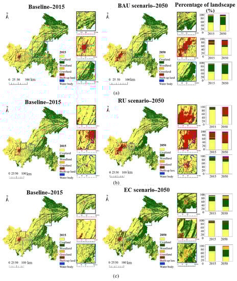 - Business as usual scenario. Land use change under this scenario reflects decade-long trends of land use change. The land use change patterns are similar to those from 2005 to 2015. Land use demands for 2020 to 2050 were estimated based on historical statistics of land use change from 2005 and 2015. The rate of land use change is considered to agree with the annual change from 2005 to 2015. The area of built-up land in 2050 was twice that in 2015, at the expense of cropland, woodland, and grassland. The area of cropland, woodland, and grassland decreased slowly at annual average rates of 0.07%, 0.01%, and 0.25%, respectively.