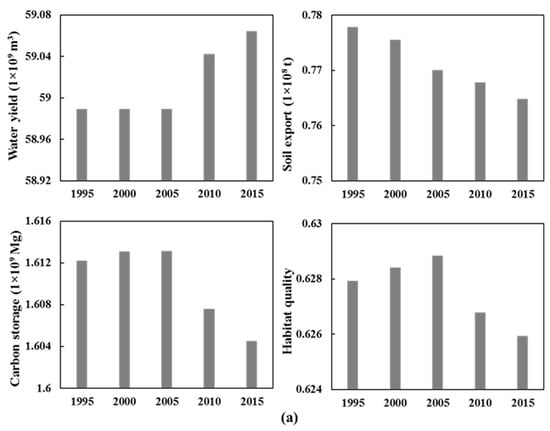 Ecosystem services (ESs) refer to the benefits gained from natural ecosystems. Due to human activities and climate change, ecosystem services undergo significant variations. Human activities, especially in terms of land use or land management change (e.g., forestry practices and agricultural practices), modify ecosystems and their spatial distribution, thereby altering the provision of ecosystem services []. Urban expansion, along with the rapid growth of the population and economy, has significantly altered regional land use patterns [], thus negatively impacting ecosystem services. Urban landscape expansion has led to losses of regional carbon storage [,], erosion prevention [], biodiversity [], and so on. Meanwhile, human activities have transformed land use to obtain desirable ecosystem services. For example, the Chinese government has launched a series of land use management practices, e.g., the Grain for Green Project (GFGP) and the Natural Forest Conservation Program (NFCP), to improve soil conservation and wildlife habitat quality []. It is necessary to have a clear understanding of how ecosystem services change over time due to human activities.