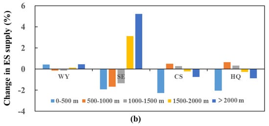 In recent decades, the land use pattern in our research area has experienced great variation due to rapid urbanization and the implementation of large-scale ecological restoration. In line with previous studies, we found that the changes in land use pattern have great impacts on the supply of ESs [,]. In mountain regions, the impact of land use change on ESs is closely related to topography []. The increased WY mainly occurred at low altitudes. In these areas, the conversion of cropland to built-up land due to urban expansion increased the impervious area, thereby increasing WY. During the past few decades, rapid urban expansion has also led to simultaneous losses of CS and HQ at low altitudes (similar to []). The implementation of large-scale ecological restoration, such as GFGP in the Yangtze and Yellow River basins, has fundamentally improved regulating and supporting services (e.g., SC, water purification, and flood control) []. In areas at altitudes of 1000–1500 m, a large amount of cropland was converted to woodland due to the implementation of GFGP, which enhanced SC, CS, and HQ.