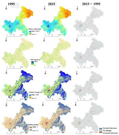 Ecosystem services experience temporal and spatial variations due to past land use change. Water yield was 59.06 × 109 m3 in 2015, an increase of 0.13% from 1995 (Figure 4a). WY in northeast Chongqing showed the lowest value due to the relatively high vegetation cover and low precipitation. The changes in spatial distribution for WY from 1995 to 2015 are shown in Figure 5. WY showed a great increase in the central area but a significant decrease in the northeast. WY increased at low and high altitudes and decreased at moderate altitudes of 500–1500 m (Figure 4b). Soil conservation improved because soil export (SE) decreased by 1.68% over the past two decades, with 0.76 × 108 Mg in 2015. SC showed improvements in changing areas. SE exhibited a decreasing trend at altitudes of 0–1500 m and an increasing trend at altitudes of >1500 m. Carbon storage and habitat quality increased slightly at first and then decreased significantly from 1995 to 2015. Improvements in CS and HQ were seen in northeast Chongqing at altitudes between 500 and 1500 m (Figure 5), while declines were seen in the western part at altitudes of 0–500 m and >2000 m. These two services showed similar spatial distribution patterns, with the highest values in the southeast and northeast Chongqing and the lowest values in the central part.