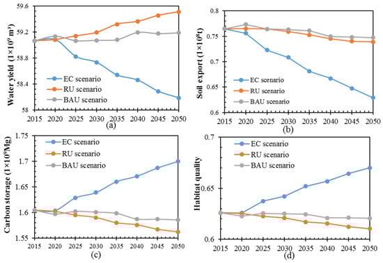 Trends of ecosystem services from 2020 to 2050 (at five-year intervals) under the three scenarios. EC represents ecological conservation. RU represents rapid urbanization. BAU represents business as usual. The changes in the provision of water yield (a), soil export (b), carbon storage (c), and habitat quality (d) under the three scenarios from 2020 to 2050.