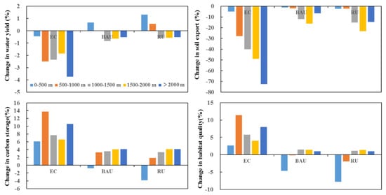 Land use in 2015 was chosen as the baseline for comparison, and 2020–2050 was simulated under the three scenarios. The change in the provision of ecosystem services is shown in Figure 6. The ecosystem services showed great differences under the three scenarios. The ecosystem services under the RU scenario are comparable to those under the BAU scenario. The ecosystem services under the EC scenario, however, showed great differences from those under the RU and BAU scenarios. The ecological conservation scenario led to declines in water yield (−1.5%) and soil export (−17.7%) due to forest expansion and a great improvement in habitat quality (+7.0%) and carbon storage (+5.9%). In contrast, habitat quality and carbon storage under the RU scenario decreased by 2.5% and 2.6%. Water yield increased as a result of the expansion of built-up area. Carbon storage and habitat quality under BAU decreased by 0.8% and 1.1% compared to the baseline.