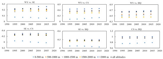 The relationships between ecosystem services from 1995 to 2015. Notes: XX vs. XX represents the relationship of XX and XX (i.e., WY vs. CS indicated the relationship between WY and CS, the same as below). The different colored dots represent the relationships between ecosystem services at different altitudes. The black triangles indicate the relationships between ecosystem services for the whole region. The numbers on the Y-axis are the Pearson’s correlation coefficients between pairs of ESs.