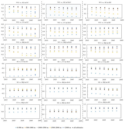 The variations in relationships between ecosystem services from 2020 to 2050 in different scenarios are shown in Figure 9. The changes in the relationship between ecosystem services under the RU scenario are similar to those under the BAU scenario. Tradeoffs between WY and SC varied slightly in different scenarios. This tradeoff was weakest at altitudes of <500 m (represented by light blue dots in Figure 9), decreased with the increase of altitude between 500 and 2000 m, and was strongest at altitudes of >2000 m in the BAU and RU scenarios. Furthermore, such a tradeoff was intensified at altitudes of <500 m and diminished at other altitudes in the EC scenario. WY showed a moderate tradeoff with CS; this tradeoff was intensified slightly in the BAU and RU scenarios and diminished in the EC scenario. The relationship between WY and CS showed a large variation in different altitudes. Such a relationship was weak at altitudes of <500 m, diminished with the increase in altitude between 500 and 2000 m, and was strong at altitudes of >2000 m in the BAU and RU scenarios. The strength of the tradeoff between WY and CS was diminished at all altitudes except for <500 m in the EC scenario. The tradeoff between WY and HQ was strengthened in the RU scenario and weakened slightly in the EC scenario. WY and HQ were correlated at altitudes of 0–1000 m and >2000 m, and moderately at altitudes of 1000–2000 m in the BAU and RU scenarios. The strength of the negative relationship between WY and HQ diminished at different altitudes in the EC scenario.