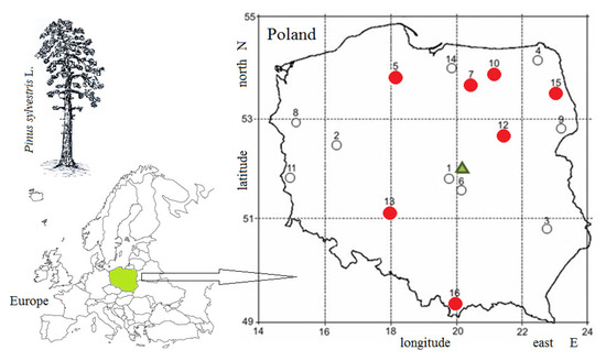 Genetic origin of Scots pine trees (red dots on the map), grown on an experimental plot at the Forest Experimental Station in Rogów (green triangle on the map): 5—Lipowa, in the Tucholskie Forest 130 m a.s.l.; 7—Dłużek, the Napiwodzko–Ramuckie Forest 145 m a.s.l.; 10—Ruciane, the Piska Forest 145 m a.s.l.; 12—Jegiel, the Biała Forest m 95 a.s.l.); 13—Rychtal, the Namysłowsko–Ostrzeszowskie Forest 190 m a.s.l.; 15—Supraśl, the Knyszyńska Forest 165 m a.s.l.; 16—Nowy Targ, the Nowotarskie Forest 590 m a.s.l.