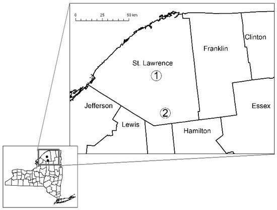 The second site lies 35.7 km to the south, on the SUNY College of Environmental Science and Forestry Ranger School Forest near Wanakena, NY, USA (44.15677° N, 74.92923° W,