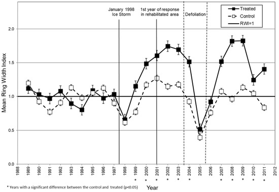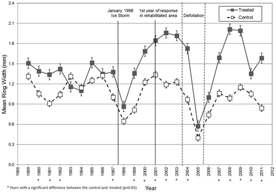 33]. Tree-ring widths included 9 years before the ice storm and 14 years afterward. We compared differences in tree-ring widths between the control and rehabilitated areas (α = 0.05) using a linear mixed model in PROC MIXED with ring width as a function of the 1989 DBH,
