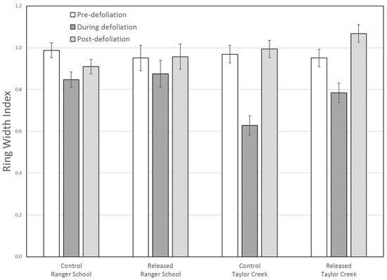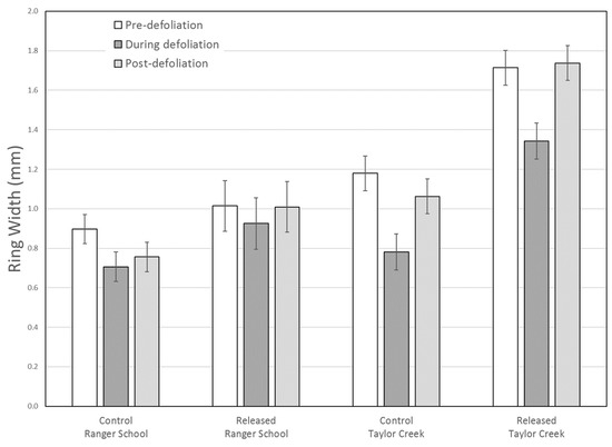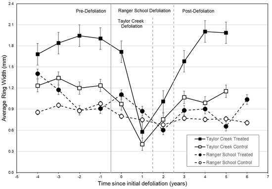 We stratified the data for each site into three defoliation periods: (1) a four-year pre-defoliation period; (2) a during-defoliation period lasting three years for Ranger School (2005–2007), and two years for Taylor Creek (2004–2005); and (3) a four-year post-defoliation period. A linear mixed model was used to predict RWI as a function of site, treatment, and defoliation period. We included a first-order autoregressive covariance structure to account for the repeated measures within trees over time periods.