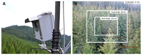 The dynamic of development of the Pgrowth was monitored by phenocameras, model PhenoCam EMS 800 (EMS Brno, the Czech Republic). The phenocameras were fixed on the top of the meteorological tower (Figure 2A). Images were taken daily, every hour between 10 a.m. and 3 p.m. during the GS. The images were captured by a CCD sensor and saved at maximum resolution (3648 × 2736 pixels) in JPEG format. Three different degrees of zoom (focal length 37, 80 and 122 mm) were captured at the same time (Figure 2B). The cameras were set to a fixed white balance regime with automatic exposure measuring. For the analysis of onset, end and duration of Pgrowth, two rules were used. The first was that only the closest trees in view angle camera were considered. The second was using the optimal distance from camera for sufficient resolution for pixel analysis. Five trees fulfilling these rules were selected at each ESP.
