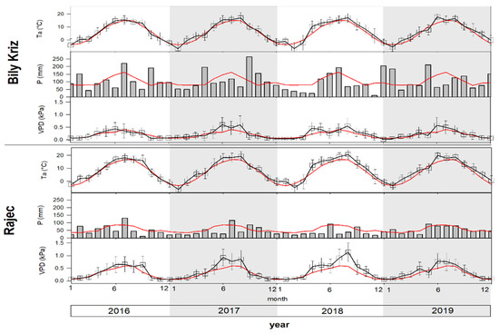 The seasonal course of monthly mean air temperature Ta (°C), monthly sum of precipitation P (mm) and monthly mean of vapor pressure deficit VPD (kPa) at the ESP Bily Kriz and Rajec in the years 2016–2019. Red lines represent long-term measurements (1961–2010). Vertical bars represent standard deviation.