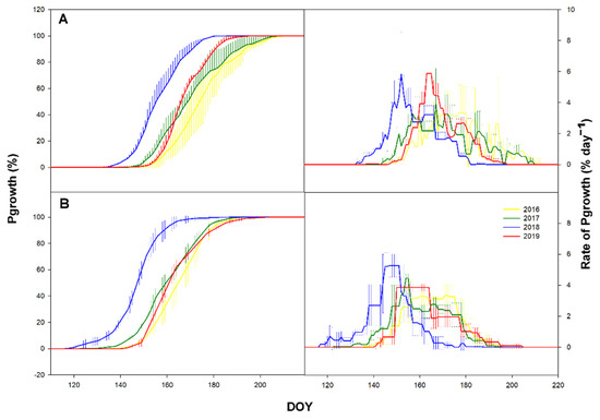 Time series of cumulative daily primary growth (Pgrowth) in % (left) and time series of daily rate (right) in % day−1 at the ESP Bily Kriz (A) and Rajec (B) in 2016–2019. Vertical bars represent standard deviation.