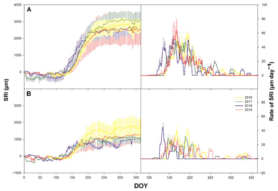 Time series of cumulative daily secondary growth expressed by stem radial increment (SRI) in µm (left) and time series of daily rate of SRI in µm day−1 (at the studied plots Bily Kriz (A) and Rajec (B) in 2016–2019. Vertical bars represent standard deviation.