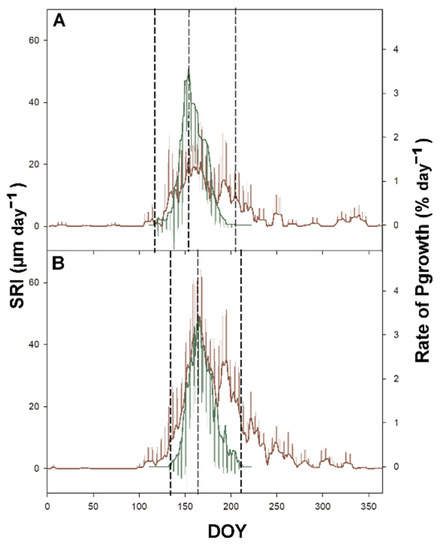 Mean value of daily rate of Sgrowth (brown line; SRI) and Pgrowth (green line; Pgrowth) calculated for all study years (2016–2019) at the ESP Rajec (A) and Bily Kriz (B). Vertical bars represent standard deviation.