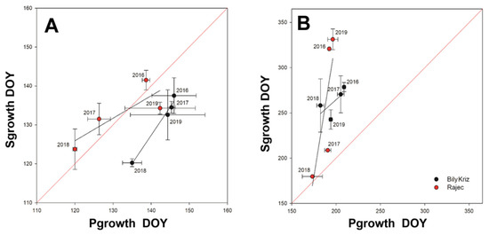 Correlation between onset (A) of primary (Pgrowth) and secondary growth (Sgrowth) and end of Pgrowth and Sgrowth (B) at the ESP Bily Kriz (black circles) and Rajec (red circles) in 2016–2019. The 1:1 red line is drawn for reference. Vertical and horizontal bars represent standard deviation.