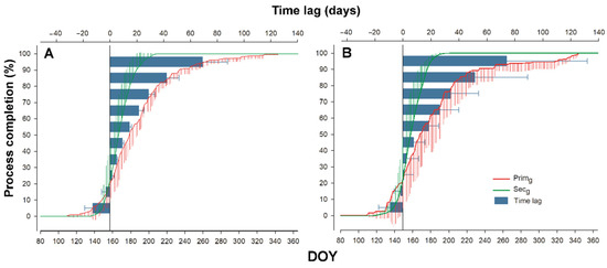 Timing and time lag of primary (Pgrowth) and secondary growth (Sgrowth) at the ESP Bily Kriz (A) and Rajec (B) in 2016–2019. Time lag between seasonal dynamics of primary growth and secondary growth, both processes are expressed in relative values (percentage of completion).