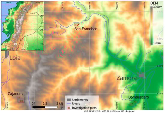 Plot locations at Bombuscaro (1000 m above sea level), San Francisco (2000 m above sea level.), and Cajanuma (3000 m above sea level). The DEM is based on SRTM data (USGS, 2006). The inlay shows the position of the research area in southern Ecuador.