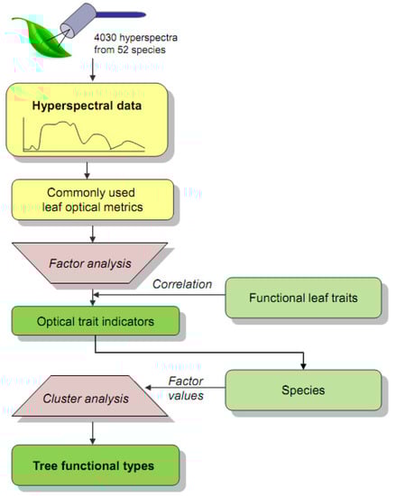 Study workflow. The hyperspectral leaf data were pre-processed and converted to commonly used leaf optical metrics (Table 1). A factor analysis was conducted to aggregate the optical metrics to optical traits indicators (OTIs), where the indication for the functional traits was documented by their correlation with species factor scores. A subsequent cluster analysis was used to assign the species to tree functional types (TFTs).