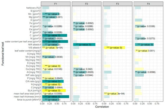 Correlations of species factor scores with functional leaf traits for the four factors. The color gradient indicates positive (green) to negative correlations (yellow). Weak correlations are depicted in lighter colors. Significant correlations are marked corresponding to the p-value: * < 0.05; ** < 0.01; *** < 0.001. Based on the correlation of the factor scores with leaf functional traits, F1 can be interpreted as the OTI (optical trait indicators) for resource acquisition and usage, F2 in terms of photosynthetic capacity and light use efficiency, F3 as photoprotection, and F4 in terms of leaf water effect on NIR albedo.